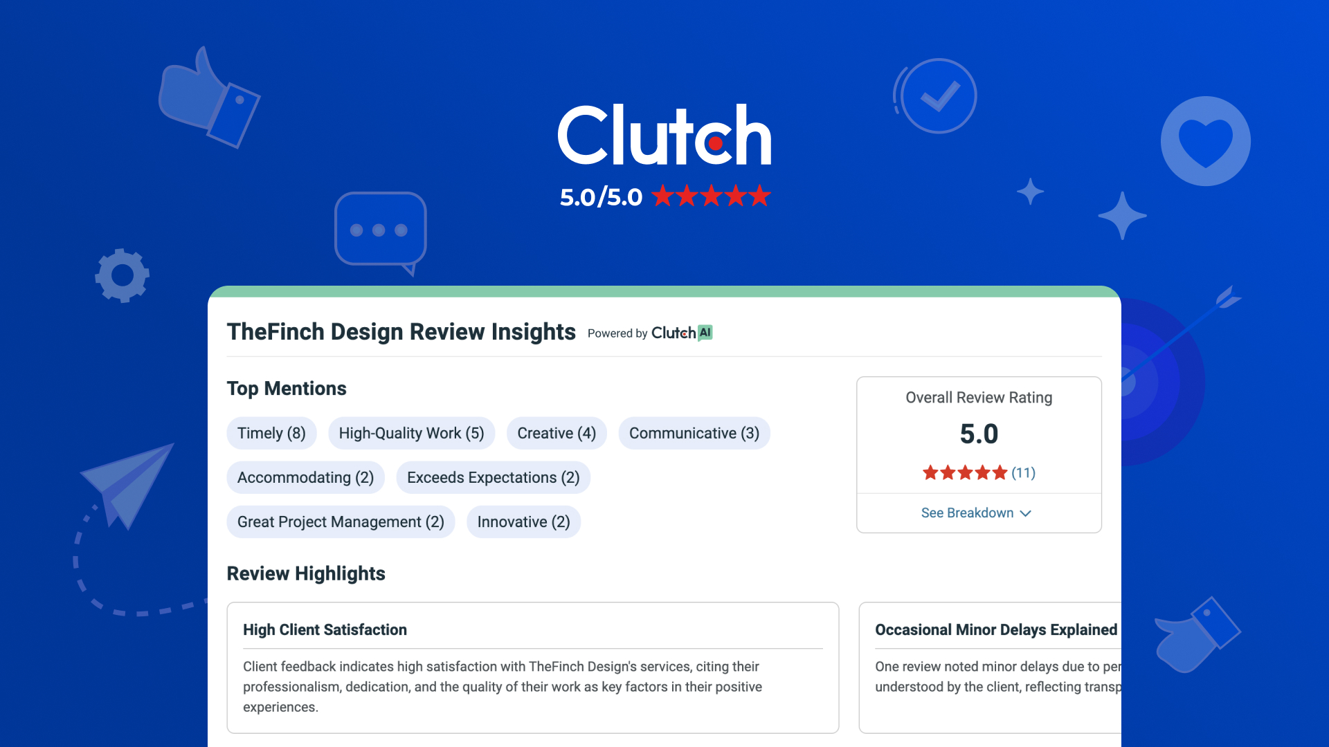 When businesses invest in digital products, they’re not just seeking design—they’re seeking clarity, performance, and measurable outcomes. At TheFinch.Design, we align design excellence with business strategy. That’s why we’re proud to be recognized on Clutch with 11 verified five-star reviews from clients across industries.